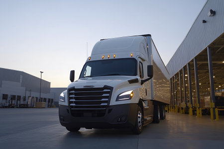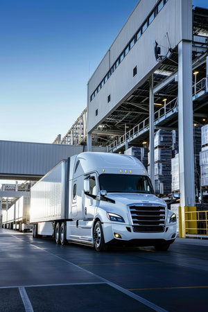 A symmetrical front view of a large white transport truck parked in front of an industrial warehouse at dawn. The truck's headlights are illuminated, and the warehouse environment suggests a busy logistics hub preparing for the day's shipments.