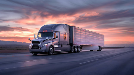 Large Transportation Truck on a highway road through the countryside at sunset.
