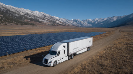 A modern truck drives along a dirt road next to a vast solar panel field, framed by majestic mountains under a clear blue sky, symbolizing sustainable energy.