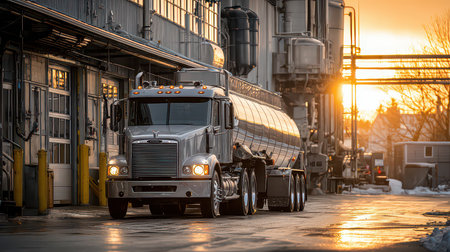 A silver tanker truck parked in an industrial area with evening sunlight creating a warm ambiance, showcasing the vehicle's importance in cargo transport and logistics.