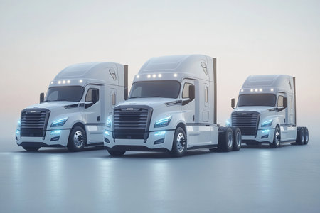Fleet of White Semi Trucks Parked in a Row at Warehouse Loading Dock, Golden Hour Illumination.