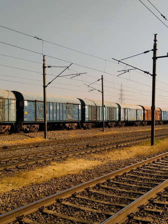 High-speed train moves by rail, delivery of goods by freight train. Train carriages at the station
