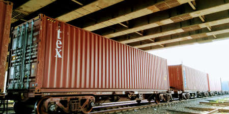Train wagons carrying freight containers for shipping companies. distribution and freight transport by a railway, transport concept