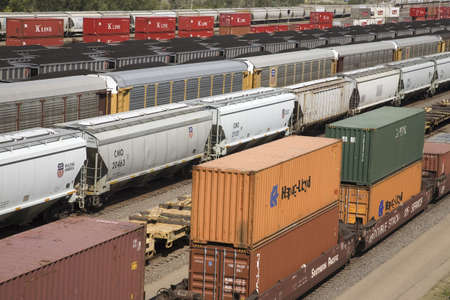 Elevated view of freight cars at Union Pacific's Bailey Railroad Yards, North Platte, Nebraska, the worlds largest classification railroad yard
