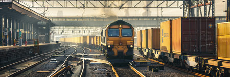 At a busy railway station, workers load containers onto a freight train under the soft morning light, bustling with activity.