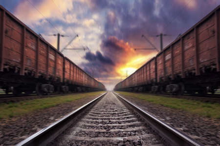 Railroad in motion with blur effect at sunset with dramatic sky. Train traveling on the railway.
