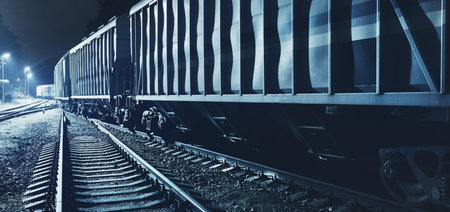 Large cargo train with goods leaving the terminal at night, wagons (containers close-up). Concept urban scene. Illumination, blue light. Freight transportation, industry, business, logistics, delivery