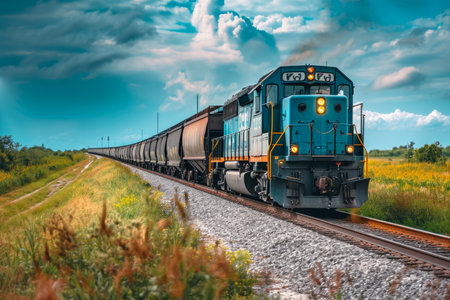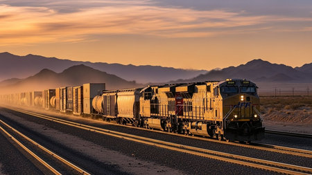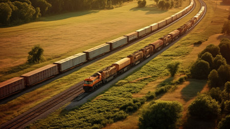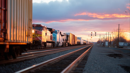 Freight Train Navigating Urban Landscape at Sunset Highlighting Transportation and Logistics Infrastructure Generative AI