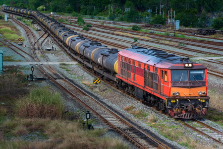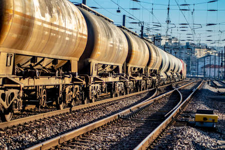 Train and wagons on the railway tracks at the station, they carry out cargo transportation