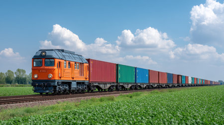 An orange freight train moves swiftly along a railway, transporting colorful shipping containers through expansive green fields under a beautiful blue sky dotted with clouds.