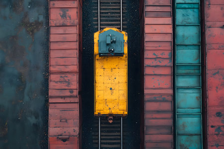 A stunning aerial perspective of a vintage yellow locomotive flanked by vibrant red and teal train cars on railway tracks. the contrasting colors and symmetrical alignment create a striking visual, emphasizing industrial design and transportation themes. Generative AI