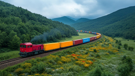 A vibrant red train pulls colorful cargo containers through a lush green valley surrounded by mountains in a serene landscape. Generative AI