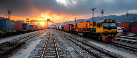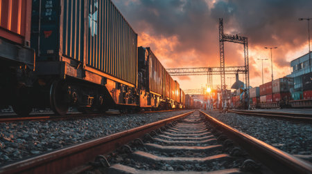 Captivating sunset view over railway tracks with cargo containers creates an industrial atmosphere. The warm light contrasts with dramatic skies, enhancing the scene's beauty.