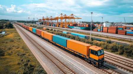 A freight train moves along railway tracks loaded with colorful cargo containers, showcasing a busy shipping yard with cranes and a vibrant industrial landscape under a blue sky.