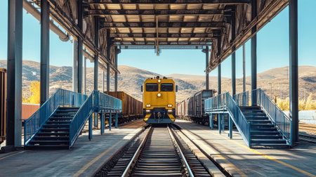 Freight train rests beneath an industrial canopy, with blue metal stairs inviting exploration. Sunlight bathes the landscape in warmth, highlighting rustic elements.