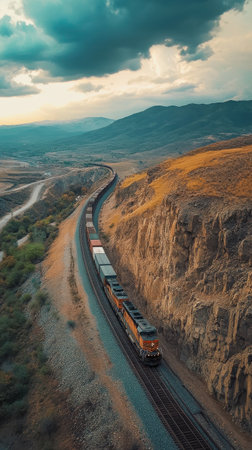 A freight train powers through a winding cliffside track, surrounded by rugged landscapes and bold atmospheric clouds. The sun sets in the background, adding warmth to the scene.