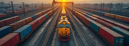 A vibrant sunset casts a warm glow over a bustling logistics hub, showcasing freight trains and container stacks amidst a dynamic urban landscape.