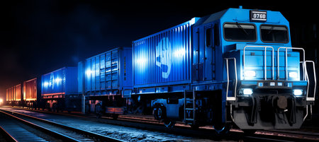A blue freight train stands stationary under a dark sky, its lights glowing brightly. The cargo containers are lined up, showcasing the movement of goods along the railway at nighttime.