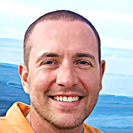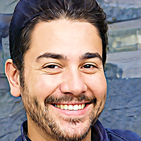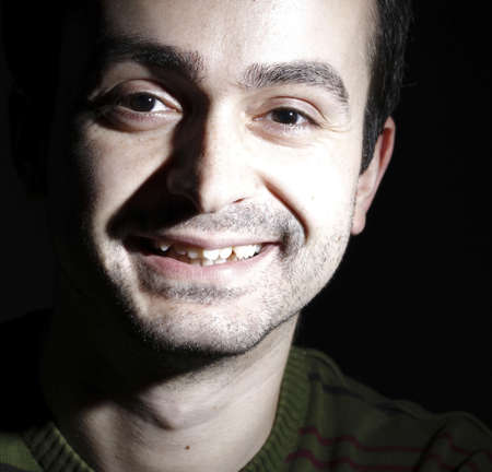 Tanned man with beard and smiles with teeth. Cheerful person. Human under sunlight. Joy, happiness and consent concept. Close-up. Front view.
