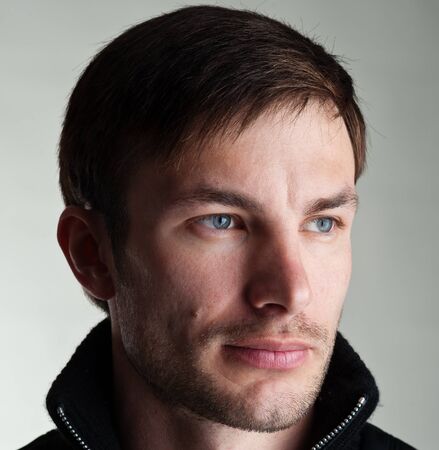 Modern smiling young man with shaved head wearing a hoodie top in a close up head shot over a grey wall