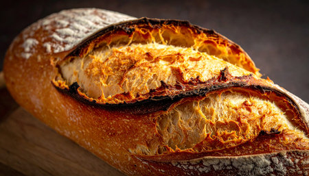 Freshly baked continental bread loaf dusted in white flour with five scores a crusty exterior and nice oven spring.