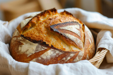 Freshly baked sourdough bread with a golden crust wrapped in a cloth