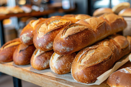 Freshly baked loaves of artisanal bread displayed on a wooden counter at a bakery in the morning light. Generative AI