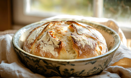 Loaf of bread in a ceramic dish, farmhouse feel
