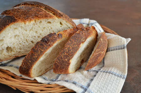 Sliced bread on wooden table. Baked bread of sourdough. Bread crust. The bread of sourdough, homemade and natural creation. The sourdough has natural yeast, which makes the food healthier, as well as