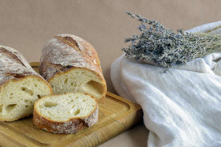 Still-life of baked bread, bouquet of dried lavender, and dish towel on craft paper in rustic style. Bread loaf, cut into pieces, on wooden cutting board. Close-up. Selective focus.