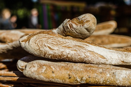 Many rustic baked traditional bread loaves on market stall outdoor.