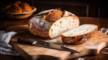 This image features a freshly baked loaf of bread made from sourdough and flour. The bread has a golden crust and is sliced diagonally, revealing its soft and chewy texture. It is placed on a wooden cutting board with a knife next to it. Perfect for food and baking related designs.