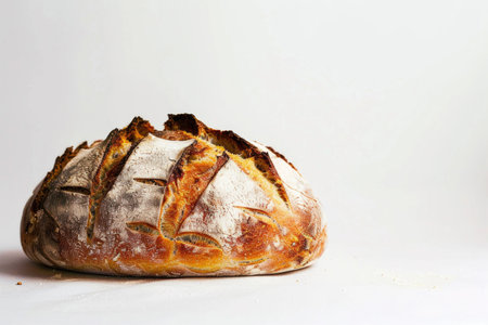 A freshly baked artisan bread loaf on a white background