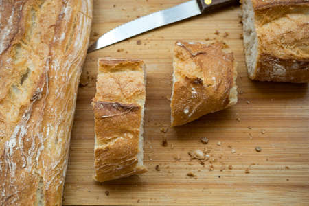 simple food ingredients concept, piece of baguette bread on cutting board with knife slicing it