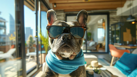 A fashionable French Bulldog wearing sunglasses and a blue scarf sits in a modern, sunlit living room with a cityscape view.