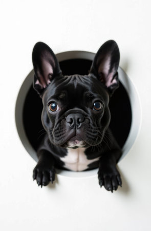 Charming french bulldog puppy peeking through a circular hole against a clean white background, creating a delightful and playful atmosphere filled with curiosity and cuteness