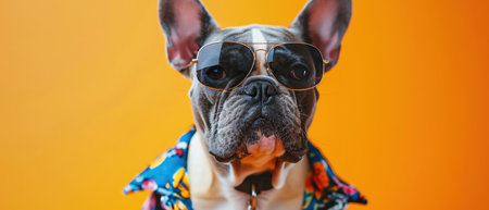 French Bulldog in stylish glasses against a yellow backdrop. dog with eyewear, showcasing intelligence. Concept of pet fashion, smart animals, canine fashion. Banner. Space for text