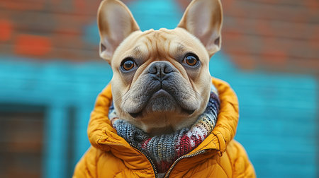 Bulldog in funky jacket, energetic orange, dynamic angle, midshot