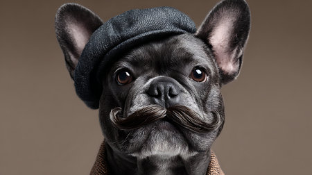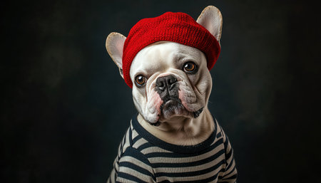 French Bulldog in a red beret and striped shirt, with a classic French style, on a dark background