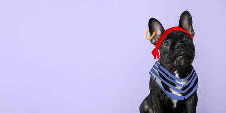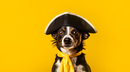 Dog in a pirate costume on a yellow background, copyspace, space for text. High quality photo