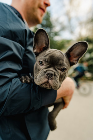 Man holding his french bulldog puppy in hands while having a walk in the park