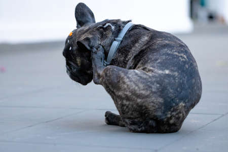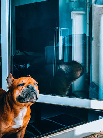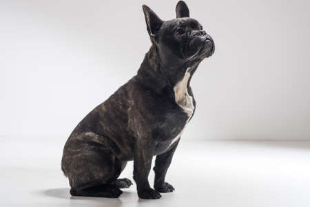 Picture of cute french bulldog dog standing on hind legs and panting in an animal themed photo shoot