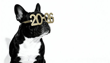 A cute black and white French Bulldog celebrates the upcoming year 2026 wearing festive golden glasses. Isolated on a white background with copy space for text.