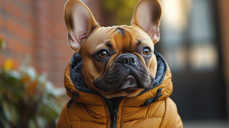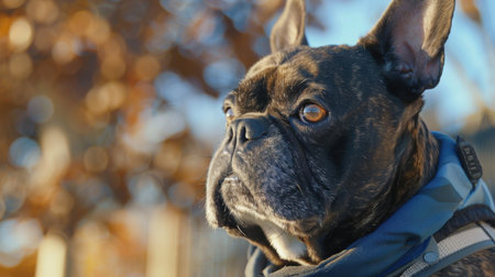 A charming French Bulldog wearing a cozy jacket gazes outdoors amid autumn leaves, capturing the essence of warmth and companionship in nature's beauty.