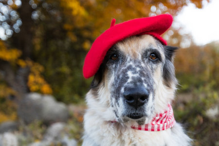 Big white and black mixed breed dog in bright beret, red and white plaid scarf in autumn park, close-up portrait