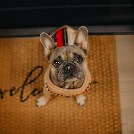 french bulldog dog in a sweter waiting by the door for a walk, top view