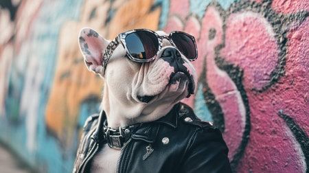 A bulldog wearing stylish sunglasses and a black leather jacket, set against a graffiti wall, showcasing a playful and edgy vibe