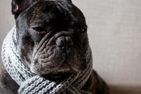 Close up French bulldog with a knitted warm scarf, cute cozy black dog.