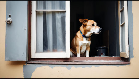 A brown and white dog peers out from a window ledge, overlooking the street with a focused and attentive gaze.. AI Generation