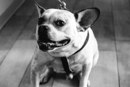 The joyful French Bulldog sits attentively, its mouth open in excitement as it gazes at treats flying above. Its playful spirit shines in this lively indoor moment.
